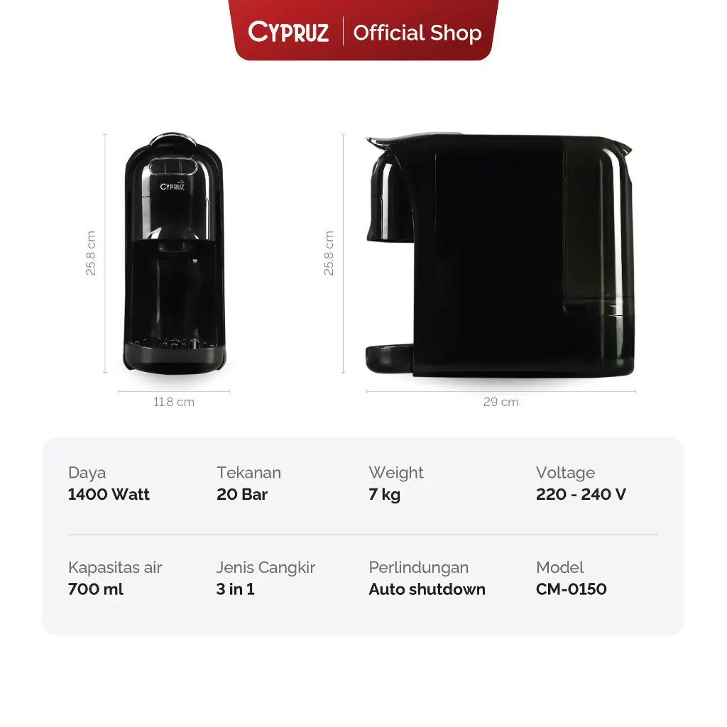 Machine Alat Pembuat Kopi 3 In 1 (Nes Capsule, Dolce, Kopi Bubuk) Cypruz Coffee Capsule Machine Alat Pembuat Kopi 3 In 1. Dengan Teknologi Terbaru Mesin Kapsul Kopi, daya Watt hanya 1400 watt. Dengan bahan pastik yang memiliki tekanan pump sebesar 20 BAR. Dapat menampung air sebesar 700 ml ini memiliki teknologi automatic touch screen yang memudahkan untuk on/off tombol sehingga dapat otomatis mati selama 10 menit. Dapat digunakan untuk 3 jeis yaitu Capsule Dolce, Nes Capsule dan bubuk kopi dengan ukuran cup kecil 40 ml dan cup besar 110 ml. Dengan pemanas yang cepat dengan adanya thermo block untuk membuat minuman menjadi cepat. Jika kekurangan air, maka langsung terotomatis berhenti dan tidak mudah slip dikarenakan memiliki silicone dibawah alat pembuat kopi. Ukuran 29 x 11.8 x 25.8 cm. Happy Shopping :) |